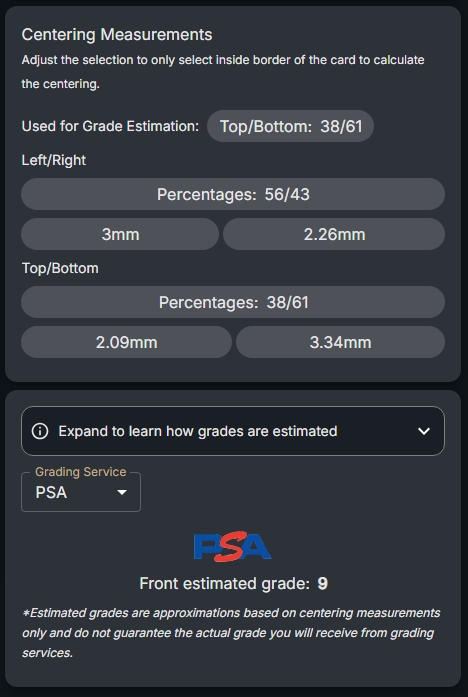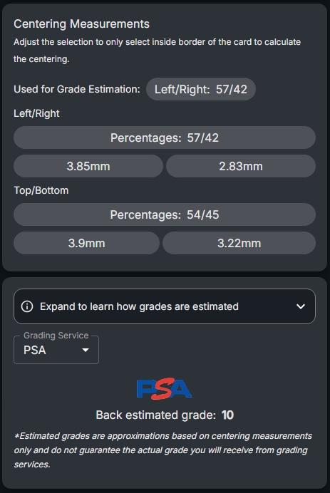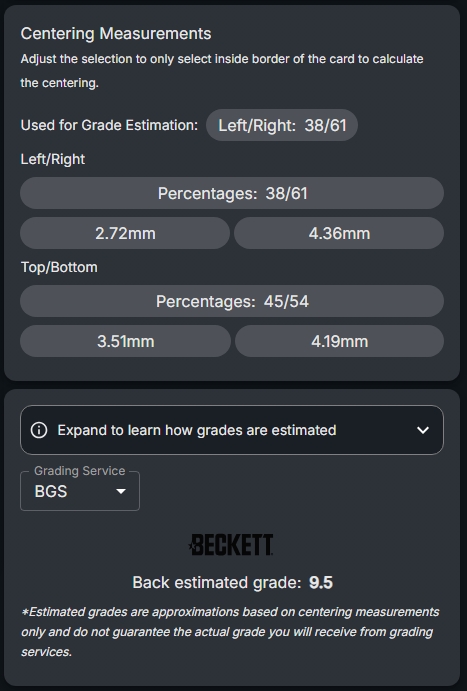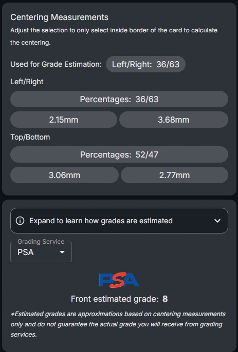 Tip: The analysis overlays show the detected card borders and calculate centering measurements. Look for the visual guides that indicate how well-centered your card is in each direction.